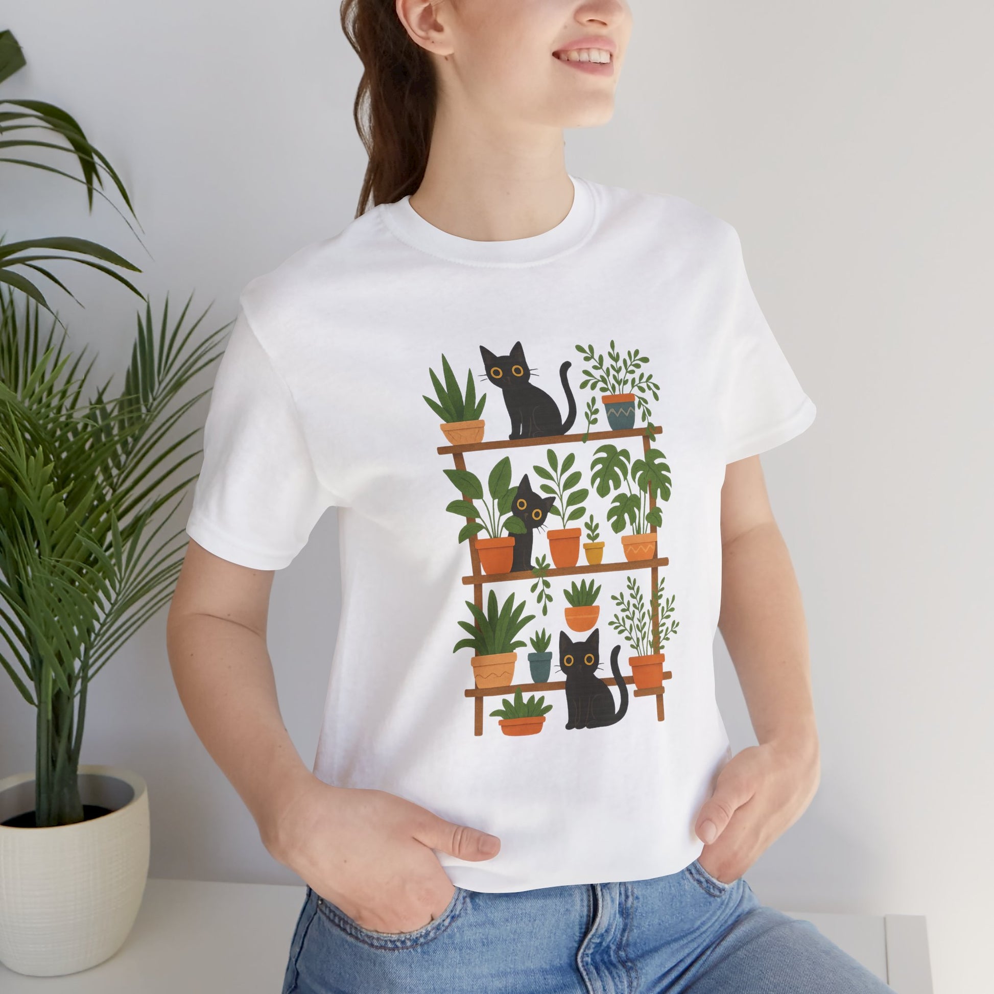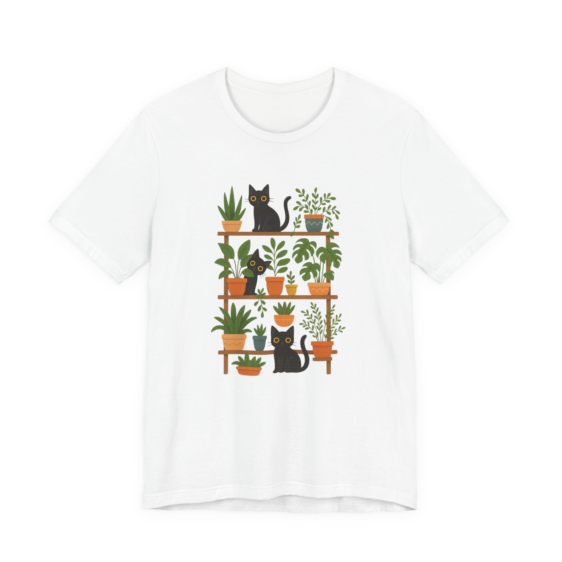 Bring charm and curiosity to your wardrobe with our Cozy Cats & Houseplants T-Shirt! This adorable design features three wide-eyed black cats playfully perched among lush green houseplants on wooden shelves. Perfect for cat lovers, plant parents, or anyone who enjoys a touch of cozy whimsy. Whether you're tending to your monstera or curling up with a good book, this shirt is sure to spark smiles.