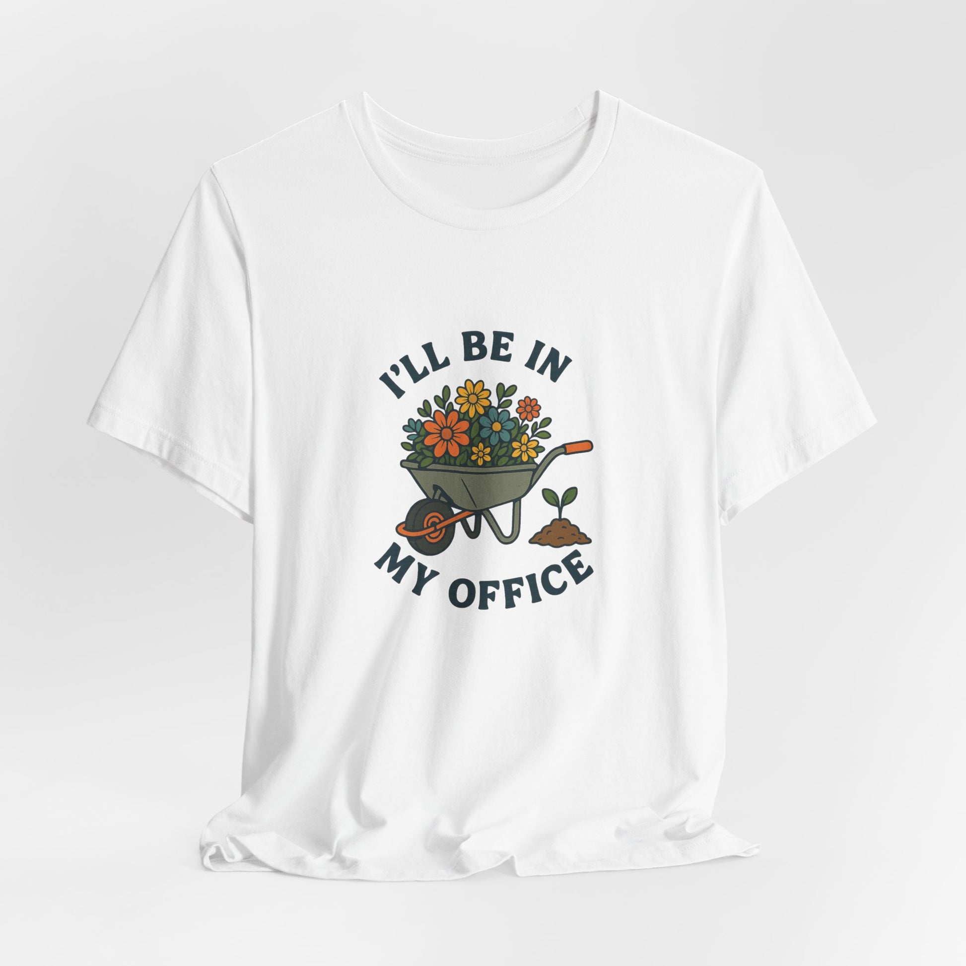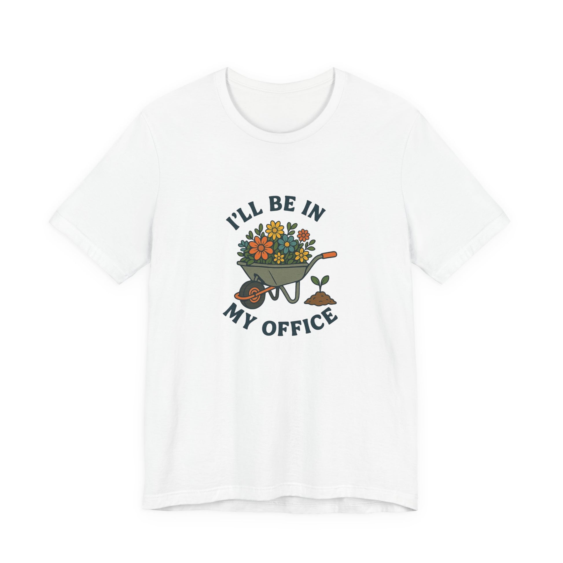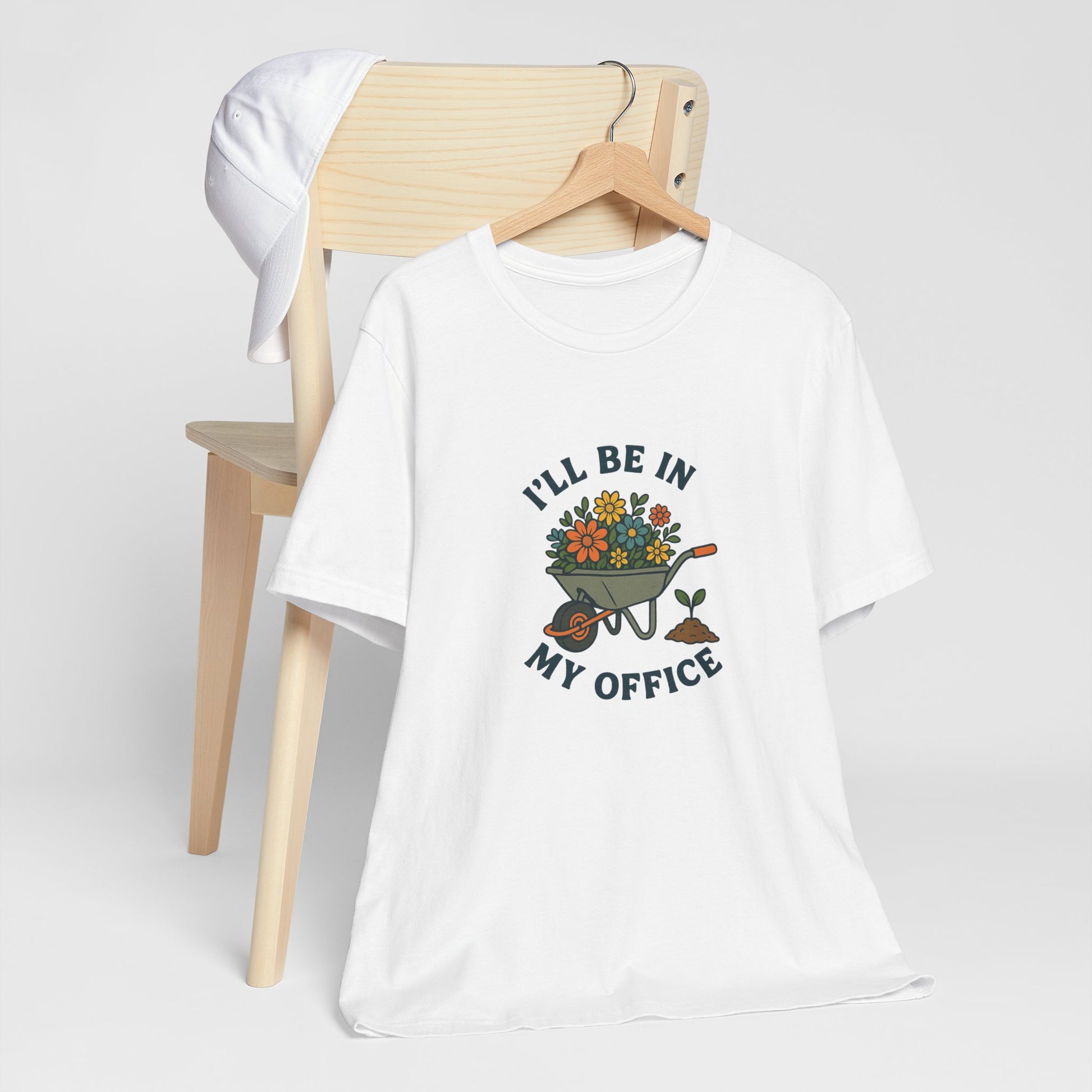 Show off your green thumb with a touch of humor! Our "I'll Be In My Office" t-shirt features a charming illustration of a flower-filled wheelbarrow and a sprouting plant—perfect for plant lovers, garden enthusiasts, and anyone who considers their backyard the real corner office. With its playful typography and earthy color palette, this tee brings personality and purpose to your casual wear.