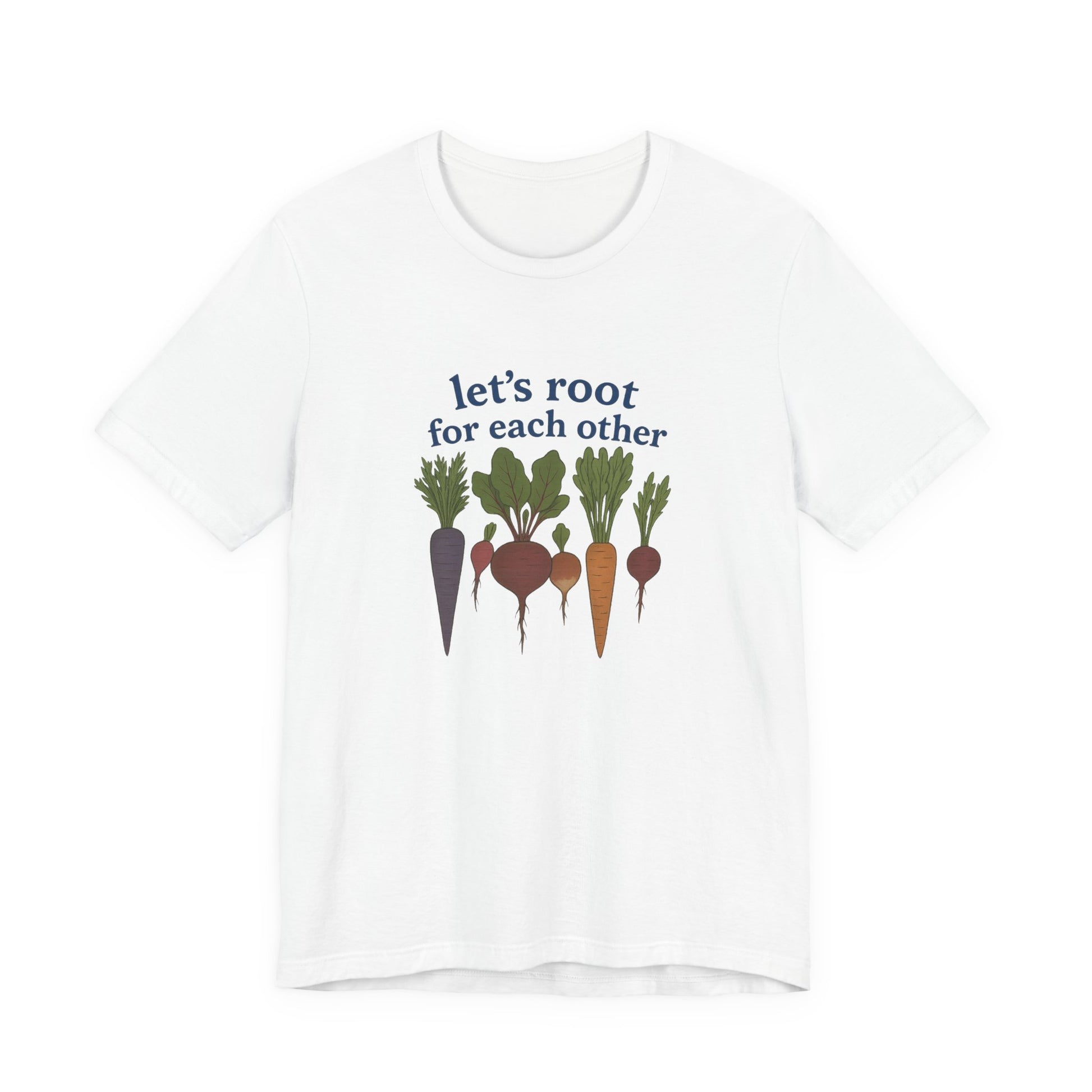 Celebrate kindness and community with this heartwarming "Let’s Root for Each Other" t-shirt, featuring a vibrant lineup of root vegetables like carrots, beets, radishes, and turnips. This earthy and playful design spreads a positive message while showing off your love for nature, gardening, or simply good vibes. Perfect for plant lovers, veggie fans, and anyone who believes in lifting others up.